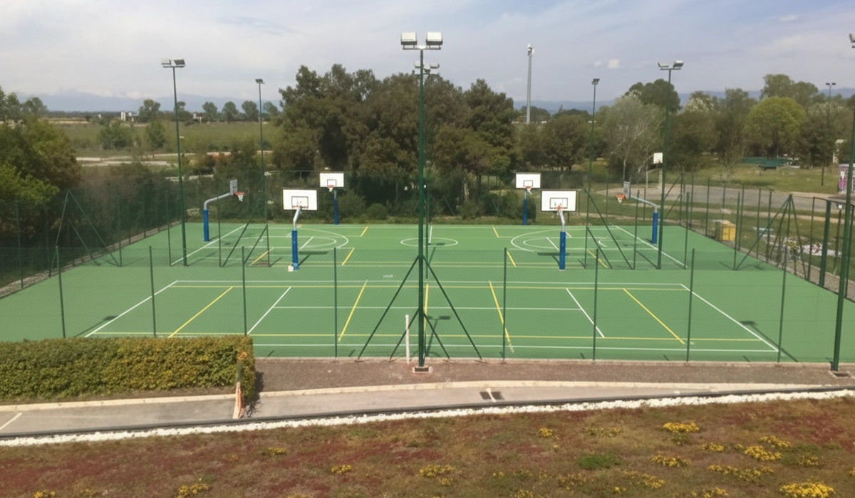 Su campi vecchi in erbetta sintetica, la si rimossa tutta, sul sottofondo vecchio in asfalto si è incollato il materassino di 4 mm in SBR, poi si è rifinito il tutto con una mano di TNS finish e una di TNS color.