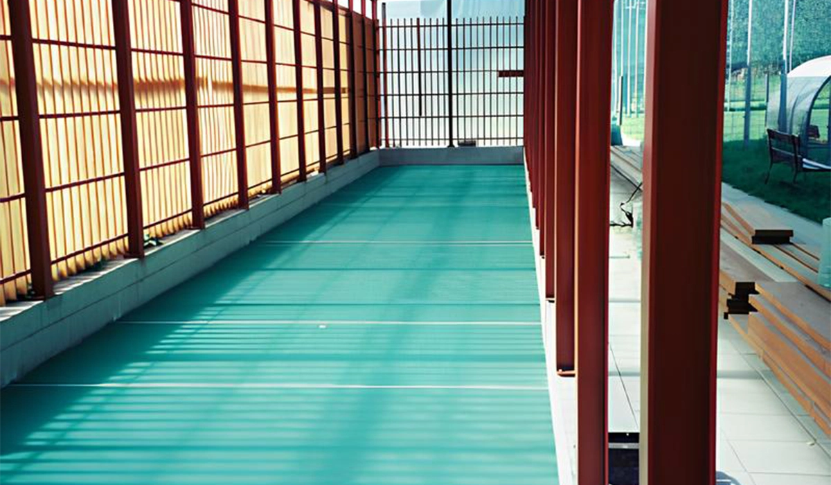 Campo da bocce sotto una tettoia a Bormio in Val Tellina, applicato su una caldana di cemento dopo avere dato una mano di primer epossidico per agevolare l’adesione del manto nuovo.