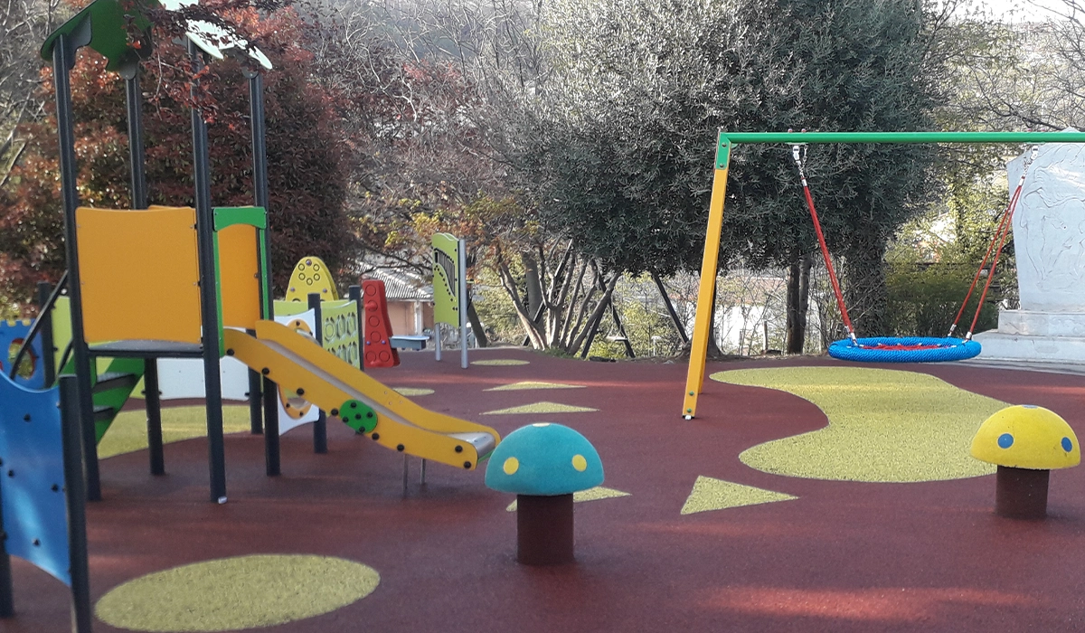 Pavimento antitrauma eseguito in due strati con disegni di colori diversi. Il primo strato è composto da gomma in granuli SBR di riciclaggio impastato con legante poliuretanico monocomponente dentro macchina impastatrice, steso manualmente con guide, rastrelli e spatole per uno spessore di 3 cm. La finitura è un composto di gomma in granuli EPDM non di riciclaggio e colorata in massa legata con legante poliuretanico monocomponente impastato con impastatrice e steso manualmente avendo curato l’aspetto superficiale finale lisciandolo e pressandolo.